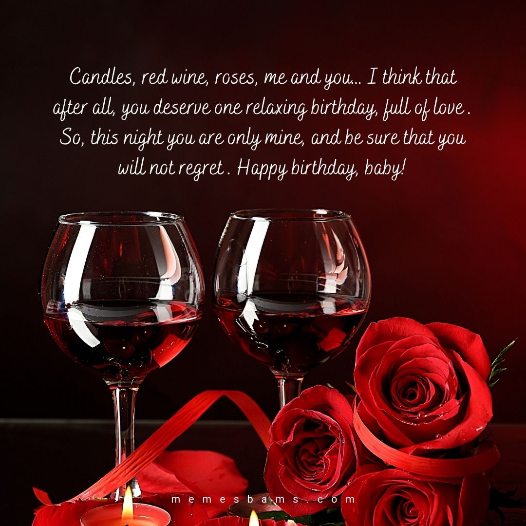 - Candles, red wine, roses, me and you… I think that after all, you deserve one relaxing birthday, full of love. So, this night you are only mine, and be sure that you will not regret. Happy birthday, baby!