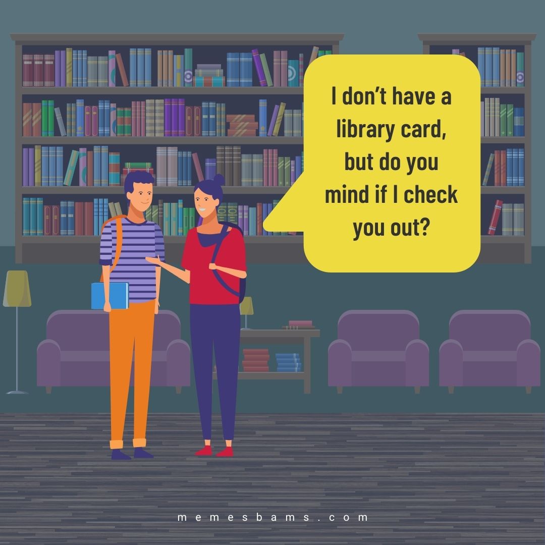 You must be a broom, ‘cause you just swept me off my feet. - I don’t have a library card, but do you mind if I check you out?